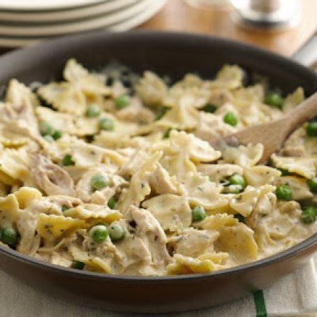 2 Add chicken, frozen peas and Italian seasoning. Cover; simmer 5 to 7 minutes longer or until pasta is tender and peas are bright green. Add salt and pepper to taste, if desired.