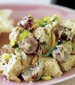 Add the chicken, grapes, scallions and almonds to the dressing and toss to coat. Serve with the naan.
