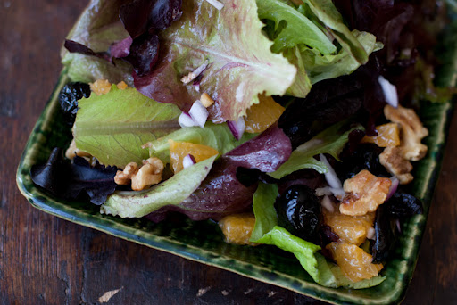 When you're ready to serve, place the salad greens in a large bowl. Toss very gently with a generous splash of the dressing. Add the orange segments and walnuts. Give another toss. Taste and decide if you need to add more dressing, if needed, add a bit more at a time, giving a good toss between additions. Make sure the nuts and citrus haven't all gone to the bottom, help them back up to the top if needed. Serve salad topped with the remaining red onion and olives.
