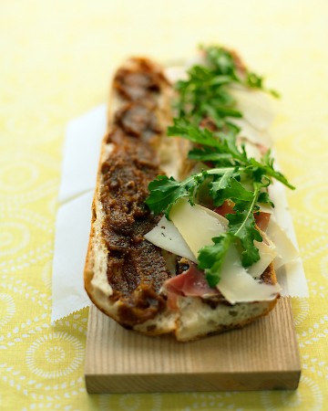 Spread 1 to 2 tablespoons Fig Spread on all 8 halves; layer 4 halves with 2 slices prosciutto, 2 thin slices Asiago cheese, and 2 or 3 leaves of arugula. Top with remaining bread halves. Serve.