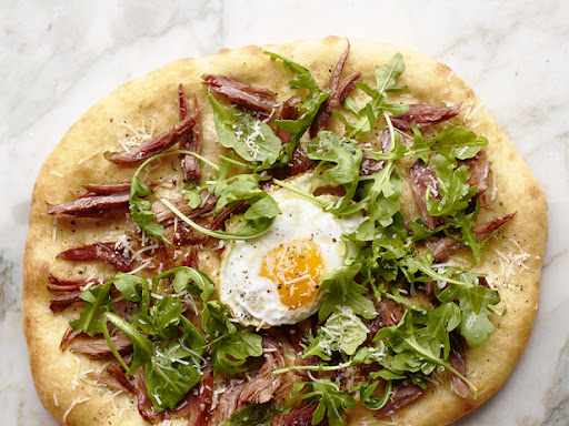 Stretch the dough into a 12-inch round on a floured surface. Put on a cornmeal-dusted pizza peel or upside-down baking sheet. Brush the dough with 3 tablespoons garlic oil; top with the duck. Slide onto the hot pizza stone or baking sheet and bake 8 to 10 minutes.
