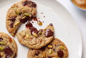 Using a wooden spoon, slowly mix in sunflower seeds, chocolate, and raisins. Scoop mounds of dough onto baking sheets.