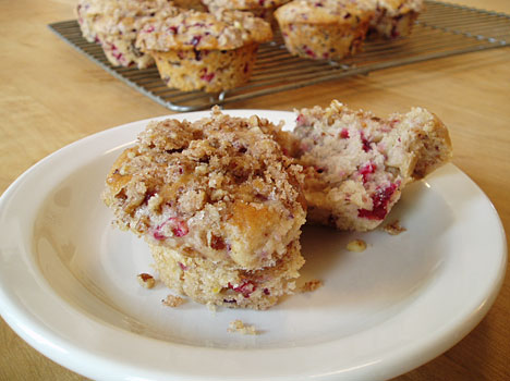 How can you resist? Cinnamon-nut streusel tops an orange-scented muffin packed with cranberries and pecans—at every altitude, this is an unbeatable combination. To get the best rise in this recipe, use 1 cup cranberries and 1/2 cup nuts. Any more fruit weighs down the batter and reduces the rise, but the taste is still great—if you don't care about looks, you can add up to 1/2 cup more cranberries, or combine fresh cranberries with Craisins. I use wheat germ for its nutritional value and texture, but you can substitute oat or wheat bran. Oil gives a slightly moister crumb than melted butter. Epicurious | October 2007