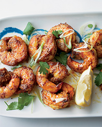 In a bowl, combine the lemon juice, serrano, garam masala, cayenne, turmeric, mustard powder and coriander. Add the shrimp and toss to coat.