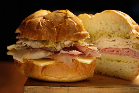Layer ham, turkey, and cheese in roll. Season with salt and freshly ground black pepper, then lightly press sandwich closed.