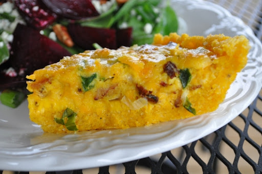 Whisk to combine the eggs, bacon, scallions, mascarpone, and cheddar cheese. Add a generous pinch of salt and pepper, and pour the mixture into the grits tart shell.