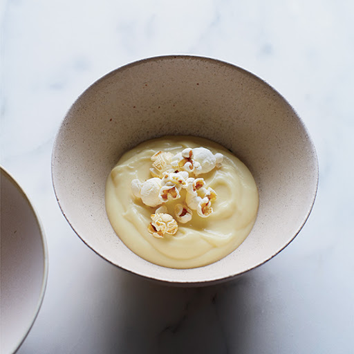 In a medium pot, heat the oil. Add the popcorn kernels, cover and cook over moderate heat until they start popping. Cook, shaking the pot continuously, until the popping has almost stopped, 2 to 3 minutes. Pour all but 1 cup of the popcorn into the cream mixture, cover and let stand for 10 minutes. Reserve the remaining popcorn for garnish.