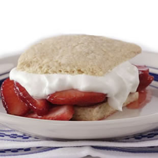 Besides succulent fresh, ripe strawberries, the key to a great strawberry shortcake lies in the quality of the biscuit. And this one is top-notch. These tender, sweet buttermilk biscuits are made with a blend of cake flour and whole-wheat flour and lightened by substituting reduced-fat cream cheese for some of the butter. As a delicately tangy alternative to whipped cream, we use a blend of cream and reduced-fat sour cream.