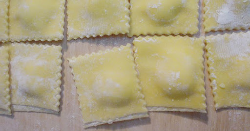 Lay dough onto floured counter. Locate and lightly mark the center of the dough with a knife. Place 1 rounded teaspoon of filling every 2 inches down the center of one half of the dough. Gently wet the edges of the filled side with wet fingertips. Fold the other half of dough over top, pressing air out from around the filling and pressing lightly along the edges. Using a ravioli or pizza cutter, cut into individual raviolis. Move to a flour-dusted baking sheet while you make more from the reserved dough in the same manner.