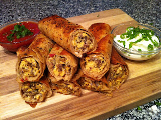 Roll tortillas tightly (packing the ends with any extra scramble mixture) Place on a buttered baking sheet