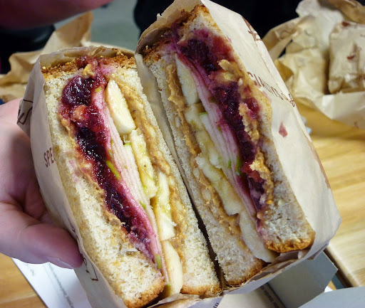 Healthy PBJ sandwich with apple, cranberry and banana.