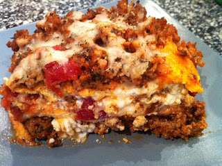 Layer 1/3 of the ground beef mixture. On top of the beef, layer 1/4 cup shredded mozzarella and 3 Tbs of Ricotta Cheese