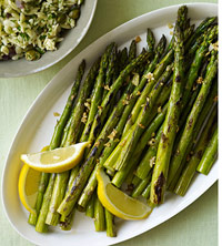 1. Heat oven to 450 degrees F. Coat baking sheet with nonstick cooking spray. Trim and discard tough ends of asparagus. Place spears in a large bowl and toss with olive oil, garlic, salt and pepper.