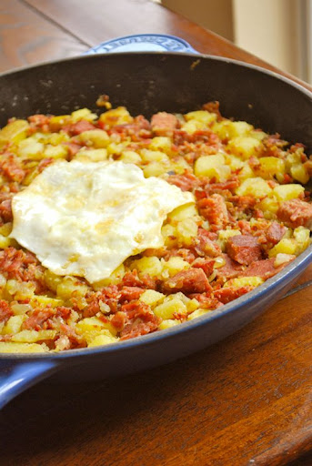 Break up a can of corned beef and throw it into the skillet. Stir well. Let all brown a bit, then push to one side of the pan.