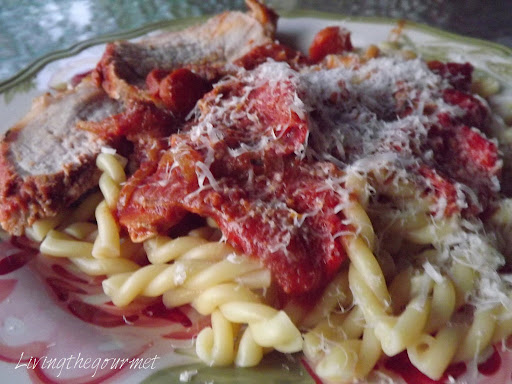 Place macaroni in a serving platter. Top with the sauce, a drizzle of olive oil and the grated Romano cheese. Slice the pork and serve with the macaroni.