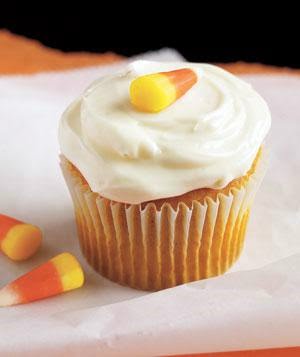 3.Meanwhile, using an electric mixer, beat the cream cheese and sugar until creamy. Spread on the cupcakes and top each with a piece of candy corn.