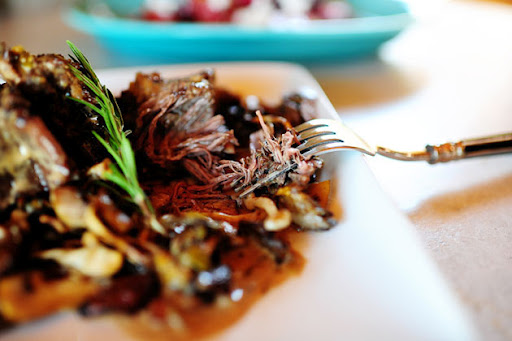 Pour wine and beef broth into the pot. Add rosemary. Stir to combine, scraping the bottom of the pot to deglaze. Return the shortribs to the pot, reduce heat to low, then cover the pot and simmer it for 2 1/2 to 3 hours. (You can also put the pot into a 300 degree oven if you’d prefer not to simmer on the stovetop.)
