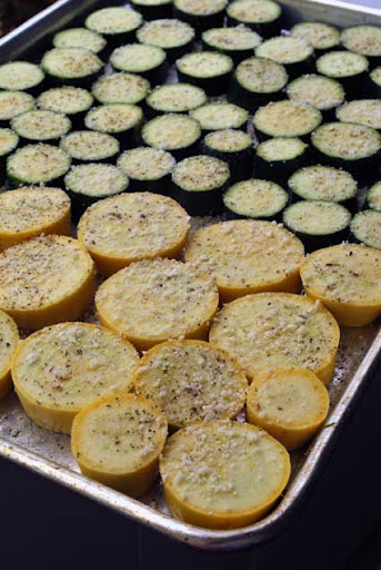 Roasted Summer Squash lightly seasoned with garlic powder, pepper and parmesan cheese.