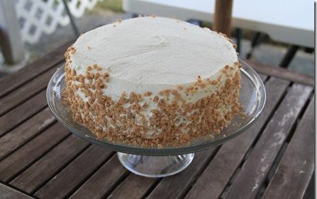7. Frost the rest of the cake with the whipped cream frosting. Gently pat the Heath bits around the edge of the entire cake. Let chill in the refrigerator for 3 hours.