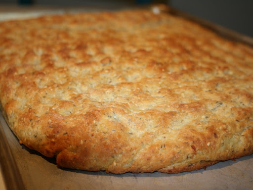 7. Uncover the dough and stretch to cover the entire baking tray. Brush with olive oil and dimple with fingertips. Sprinkle with kosher salt, pepper, and thyme. Proof for 15 minutes. Bake for 10 minutes, turn around and bake another 6 to 8 minutes.