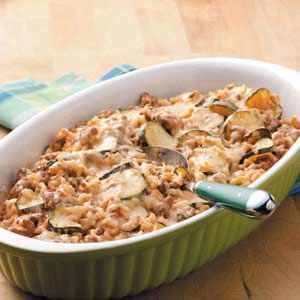 •In a large skillet, cook beef over medium heat until no longer pink; drain. Add the butter, zucchini, mushrooms and onions; cook and stir until vegetables are tender. Drain. Stir in the chili powder, salt and garlic powder. Add the rice, chilies, sour cream and half of the cheese. • Transfer to a greased 2-qt. baking dish; sprinkle with remaining cheese. Bake, uncovered, at 350° for 20-22 minutes or until cheese is melted. Yield: 4 servings.