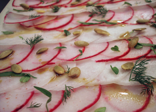 Using a mandoline slice the radishes into very thin slices. They should be pliable and translucent.