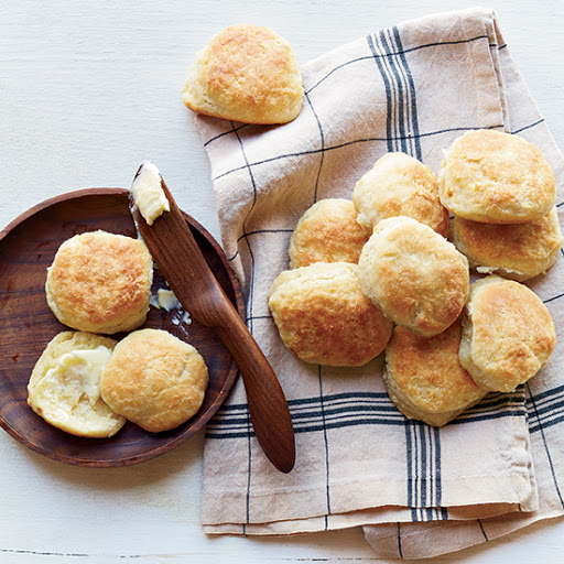 Scrape the dough out onto a lightly floured work surface and pat it into a 3/4-inch-thick round. Using a 2-inch round biscuit cutter, stamp out biscuits as close together as possible. Gently press the scraps together and stamp out more biscuits. Arrange the