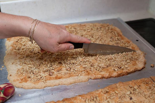 Spread mixture into a rectangle on ungreased jelly roll pan to 1/4 in thick or less. Brush slightly with beaten egg white and aprinkle with chopped nuts.