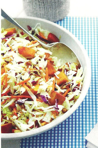 3. Add coleslaw mix, and toss to coat. Gently stir in peaches. Stir in pecans; add salt to taste. Serve immediately or chill up to 8 hours, stirring in pecans and salt to taste just before serving.