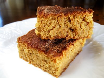 3. Stir in the flour mixture until well blended. Spread evenly in prepared pan (mixture will be somewhat cookiebatter-ish, so it’s best to spread it out with a greased spatula or your hands). Combine the granulated sugar, cinnamon, and nutmeg in a little bowl. Evenly sprinkle cinnamon sugar mixture over the top of the batter.