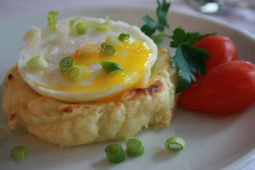 Spoon mixture into 6 equal-sized mounds on a buttered baking sheet. Use back of spoon to form shallow nests. at this point, potato nests can be covered and stored in refrigerator.