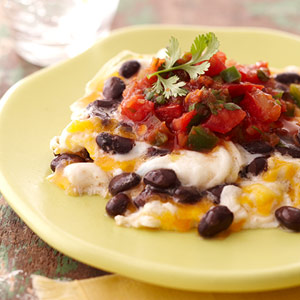 Scramble eggs with beans and cheese. Top with salsa. Serves 2
