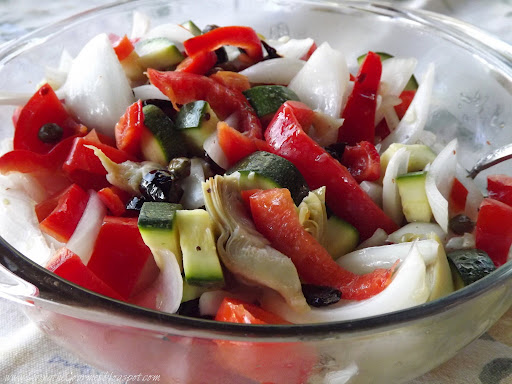 Place all of the vegetables in a bowl. Prepare the marinade and pour over the vegetables.