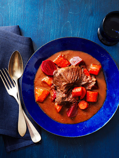 Meanwhile, puree the chopped chard, lemon juice, scallions, celery leaves, 1 1/2 cups water and 1 teaspoon salt in a blender until smooth. Remove the pot from the oven; stir in the chard puree, beets, carrots, sweet potatoes and sugar. Return the pot to the oven and cook, uncovered, until the meat and vegetables are tender but hold their shape, 1 hour, 30 minutes to 2 hours. Remove the bones from the short ribs; skim the fat off the sauce. Season with salt and pepper. Ladle the meat, vegetables and sauce into shallow bowls.