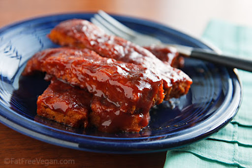 Remove it from the oven and carefully re-cut each strip, going over each cut to make sure that the ribz will pull apart easily later. Generously brush the top with barbecue sauce. Take it to the grill and invert the whole baking dish onto the grill (or use a large spatula to lift the seitan out, placing it sauce-side down on the grill). Brush the top of the seitan with more sauce: