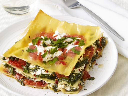 Grill the packets, covered, until tender, about 10 minutes per side. Let rest 5 minutes. Meanwhile, mix the grated tomatoes, a pinch of salt, the reserved 1/4 teaspoon garlic and 1 tablespoon olive oil in a bowl. Open the packets and cut the lasagna in half, if desired. Top with the tomato mixture, ricotta and herbs.