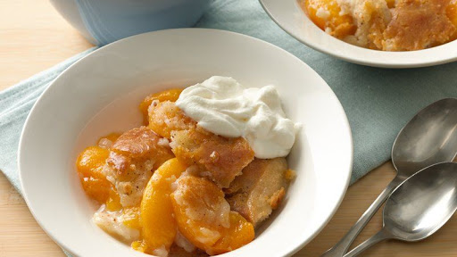 Stir together Bisquick mix, milk and nutmeg in ungreased square baking dish, 8x8x2 inches. Stir in butter until blended. Stir together sugar and peaches; spoon over batter.