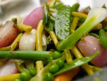 Bring a large pot of water to the boil. Blanch all the vegetables separately, in order of color (like laundry). Refresh each in iced water. Drain.