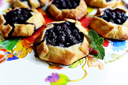 Unroll the two discs of dough. Using a 5-inch round pastry cutter (or you can trace a knife around a 5-inch bowl) cut three rounds of pastry from each disc. Re-roll the scraps and cut 2 more. Place them on 2 baking sheets lined with a baking mat or parchment (4 rounds each pan). Evenly distribute the blueberry mixture between the six discs (approximately 1/4 cup per round).