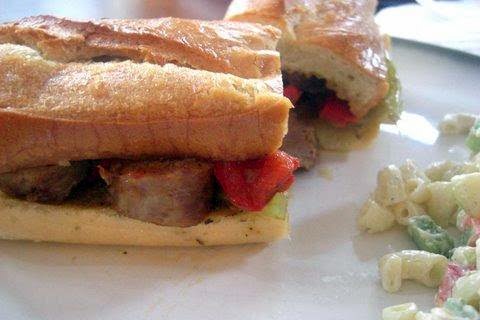Combine the cooked peppers and onions to the sausages. Add hot peppers and hot pepper juice to the skillet. Toss and turn the sausage, peppers and onions, picking up all the drippings from the pan. Pile the meat and peppers into the garlic sub rolls and serve.