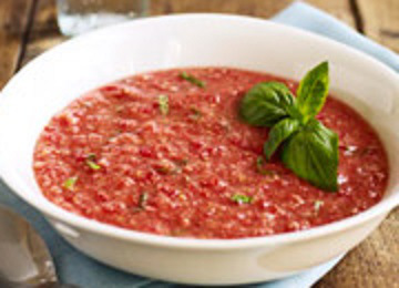In food processor pulse bread until coarsely chopped. Add tomatoes and garlic; pulse until soup is almost pureed. Pour soup into a bowl; stir in chopped basil, sugar and salt. Cover and refrigerate until well chilled, at least 2 hours or overnight. Garnish each serving with basil leaves. Makes about 6 cups.