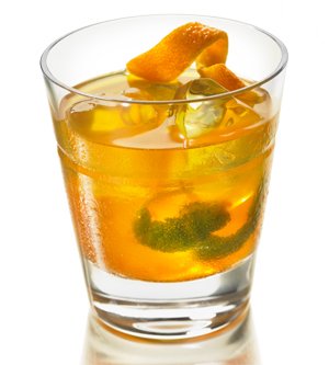 Fill a mixing glass with ice and add all ingredients. Shake well and pour into a rocks glass. Garnish with lime and orange twists.