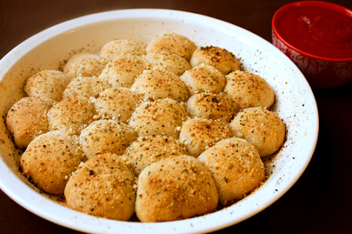 Brush the tops of the dough balls with olive oil (or melted butter) and then sprinkle with the garlic and Italian seasoning. Top with Parmesan cheese.