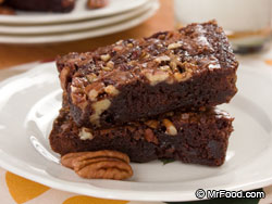 In a large bowl, prepare brownie mix according to package directions. Pour into prepared baking dish. In a medium bowl, combine corn syrup, butter, vanilla, brown sugar, and pecans; mix well. Drop the pecan mixture by spoonfuls into the batter.