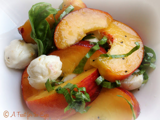 A Classic Italian Caprese salad has three components: fresh tomatoes, mozzarella and basil. This is a fun twist, using peaches instead of tomato and it's a beautiful blend of sweet and savory. This recipe is slightly adapted from the food blog "My Carolina Kitchen". Thanks, Sam!