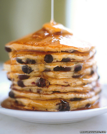 3. Using a 4-oz. ladle, about 1/2 cup (for a 6-inch pancake), pour the batter in pools 2 inches apart. If you wish to make blueberry pancakes, arrange a handful over the cooking pancake, pressing them in slightly. When the pancakes have bubbles on top and are slightly dry around the edges, about 2 1/2 minutes, flip over. If any batter oozes or blueberries roll out, push them back under with your spatula. Cook until golden on bottom, about 1 minute.
