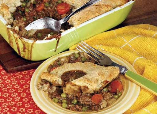 For the crust: Combine the flour, baking powder, salt and shortening with a blender or your fingers. Add the milk and PARSLEY and mix well. Spoon the topping batter in dollops over the filling. If it's going in the oven, smooth it out over the top of the casserole, for stovetop cooking just leave the dollops. Bake at 375-400° until the topping is slightly brown, 10-15 minutes, or cover and cook on the stove over medium heat 10-15 minutes (the topping doesn't brown much for stovetop cooking).