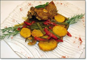 A parte en otra bandeja, colocar las patatas peladas y cortadas a rodajas, aliñar con sal, ajo y perejil picados. Añadir aceite de oliva y agua. Meter al horno y cocer hasta que la patata esté cocida y ligeramente tostada en su parte superior. Se puede añadir un poco del jugo del asado colado y sin grasa para realzar su gusto.
