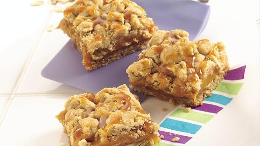 4 Spread caramel mixture evenly over crust. Crumble remaining dough mixture evenly over caramel. Bake 20 to 25 minutes longer or until light golden brown. Cool 1 hour. Run knife around sides of pan to loosen bars. Refrigerate 1 hour or until firm.