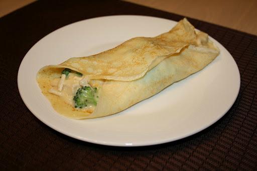 Cook broccoli and set aside. Melt butter. Blend in flour, salt, and nutmeg. Add milk, cook and stir until thick and bubbly, 2 minutes. Add Swiss cheese and cook until melted. Set aside. Combine chicken, broccoli, and 1 cup cheese sauce. Spoon 1/4 cup filling along center of un-browned side of crepes. Roll and place seam in pan. Pour remaining cheese sauce over and sprinkle with paprika. Cover and bake at 375 degrees for 18-20 minutes. Place under broiler for a few minutes to brown top. Be careful not to burn cheese.